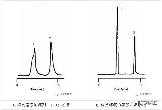 1、样品溶液的溶剂很可能强于流动相。例如样品溶液的溶剂是100%乙腈(100%的强溶剂),而流动相的组成则较弱,18%的乙腈与72%的水;