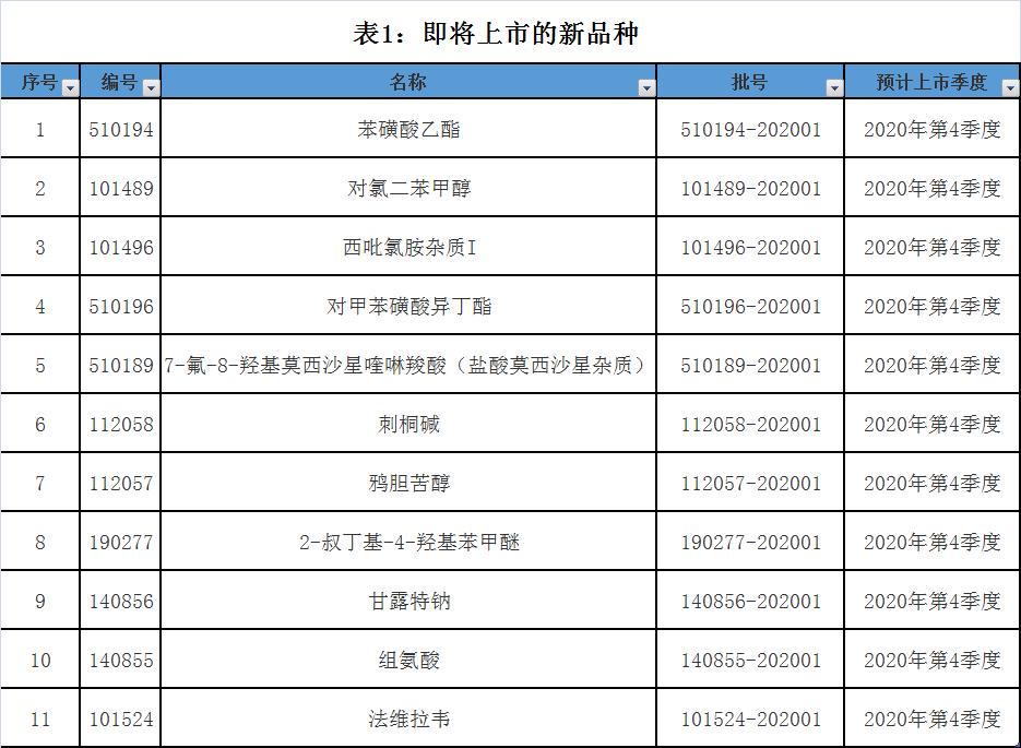 现发布2020年第九期国家药品标准物质供应新情况,包括11个即将上市的新品种,42个即将换批品种的预计上市时间,40个即将失效品种的有效使用期限,详见表1、表2和表3。