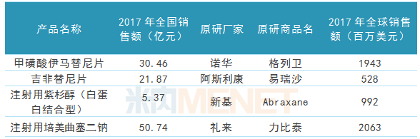 从2017年中国公立医疗机构终端竞争格局看,注射用培美曲塞二钠的市场基本实现仿制替代,江苏豪森药业与齐鲁制药合占超70%的市场份额;吉非替尼片的市场由原研厂家与首仿企业瓜分,原研厂家占据大部分市场份额;甲磺酸伊马替尼片的市场由原研厂家及2家仿制药企业瓜分,原研厂家所占市场份额较大;注射用紫杉醇(白蛋白结合型)的市场由原研厂家独占,石药欧意药业与江苏恒瑞医药实现仿制替代原研的空间较大。
