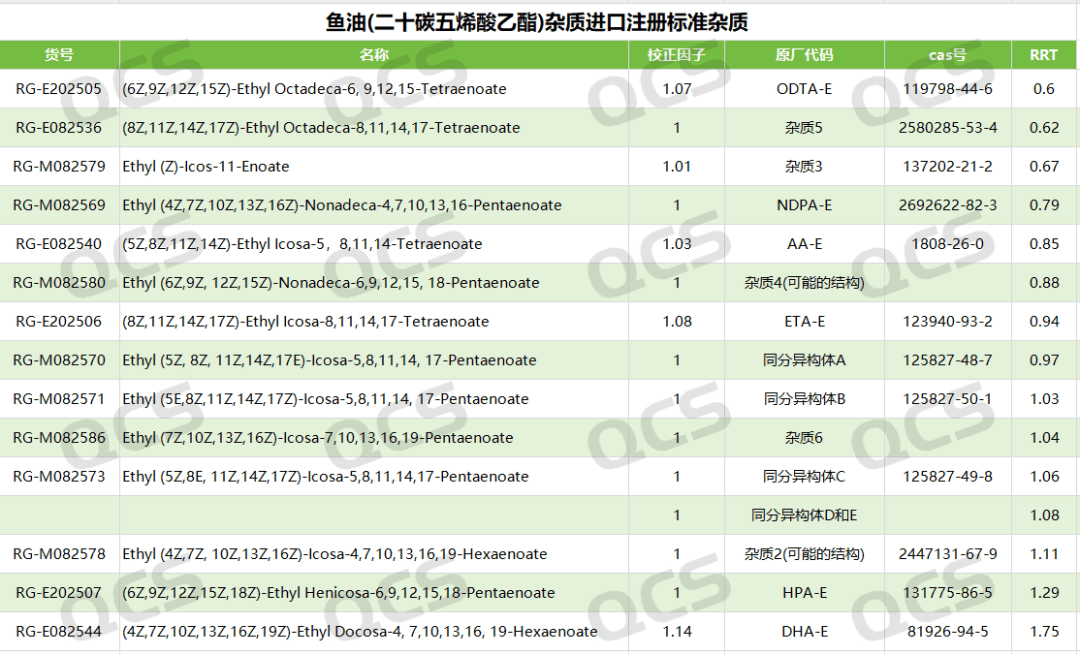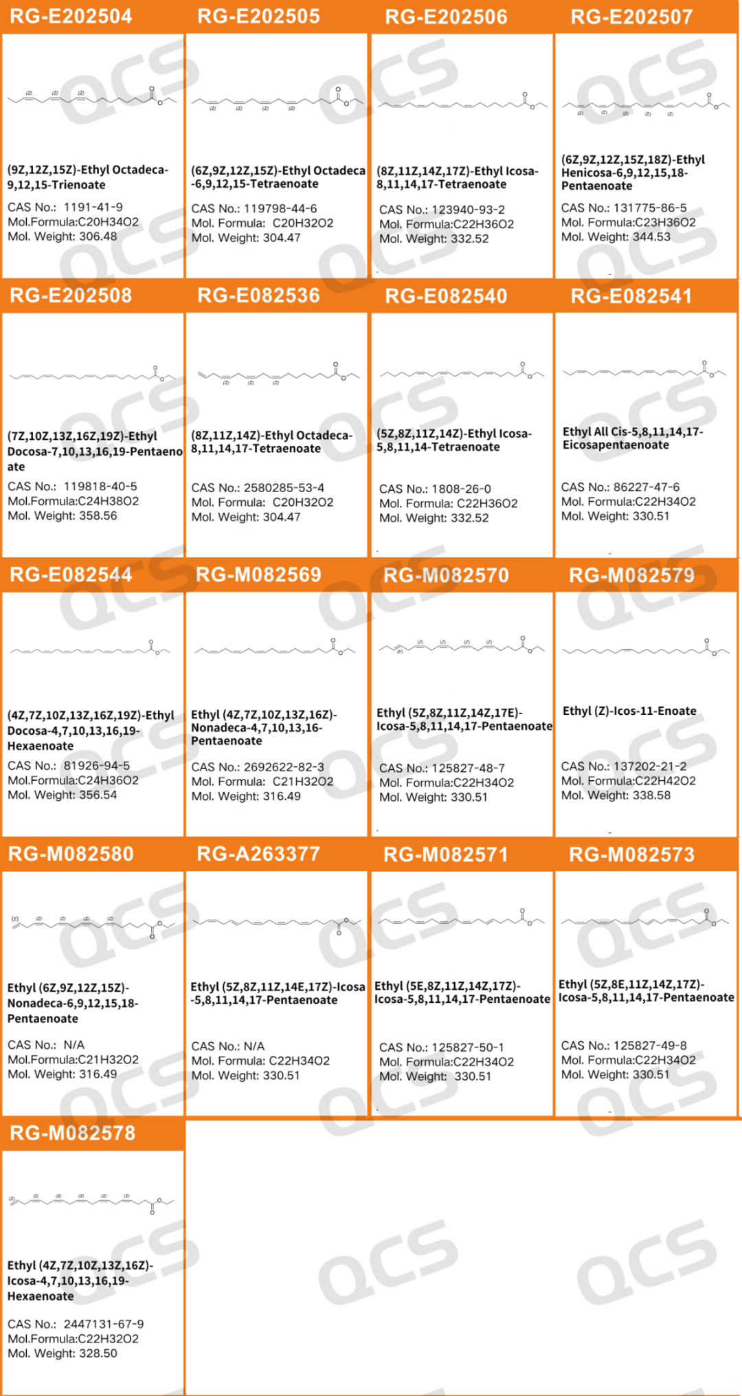 Due to the sensitivity of ethyl eicosapentaenoate to strong acids, strong bases, high temperature, and strong light, the cis-dual bond in its structure may undergo isomerization, resulting in cis-trans isomer impurities. To ensure strict quality control of ethyl eicosapentaenoate in pharmaceuticals, our company has conducted research on 16 related substances of ethyl eicosapentaenoate.
